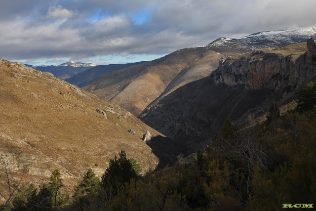 Hacia adelante la Muela aparece manchada de blanco. Pero en el desfiladero nada de nieve. El camino se pierde en algún punto, pero más por despiste mío, que por dificultad en seguirlo.